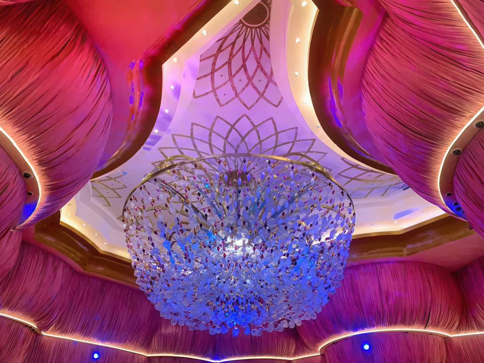 • We were tasked with the intricate installation of the casino’s stunning ceiling design, which features multi-layered drapery and a central crystal chandelier. The complexity of the setup required precision to ensure both aesthetic appeal and structural integrity.