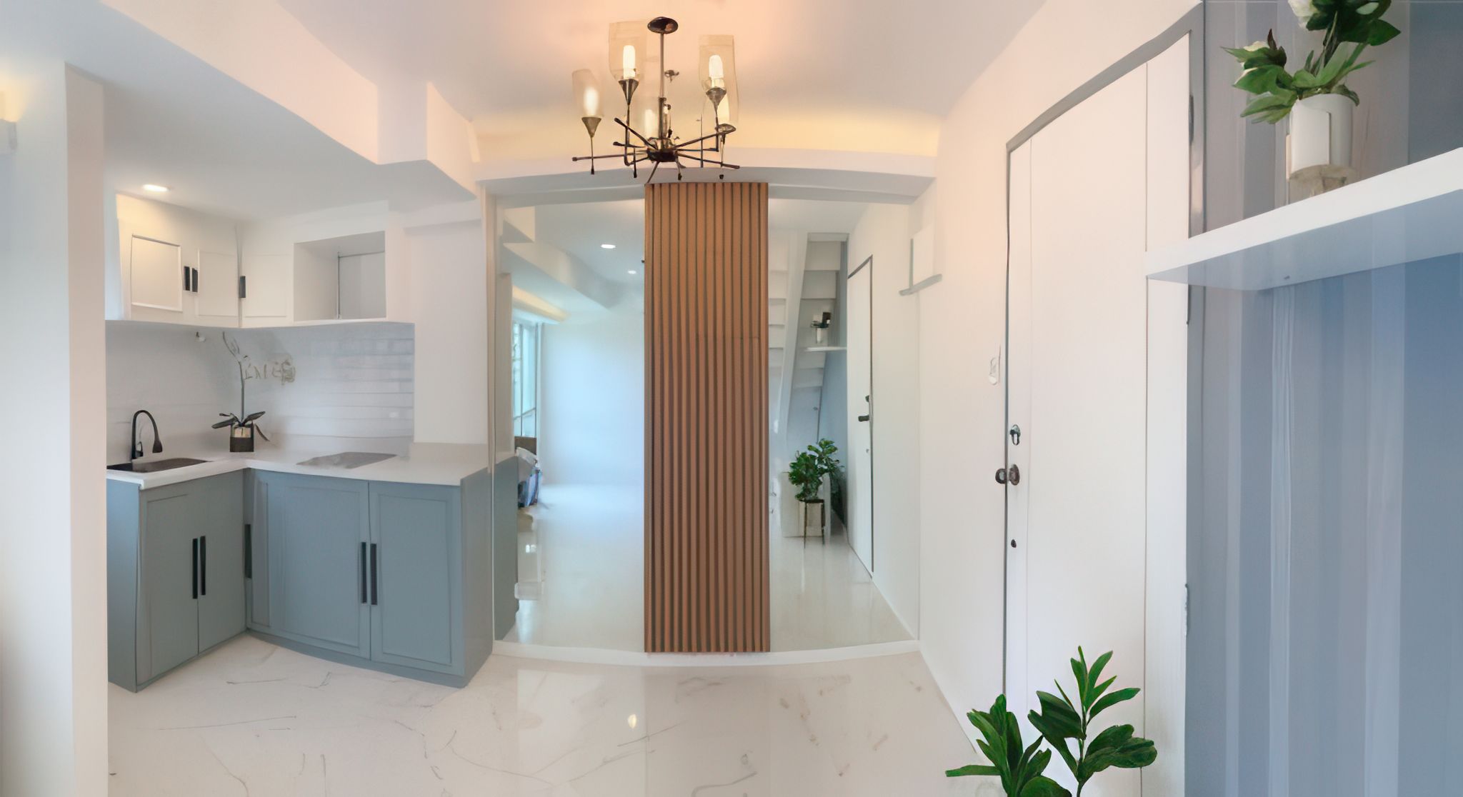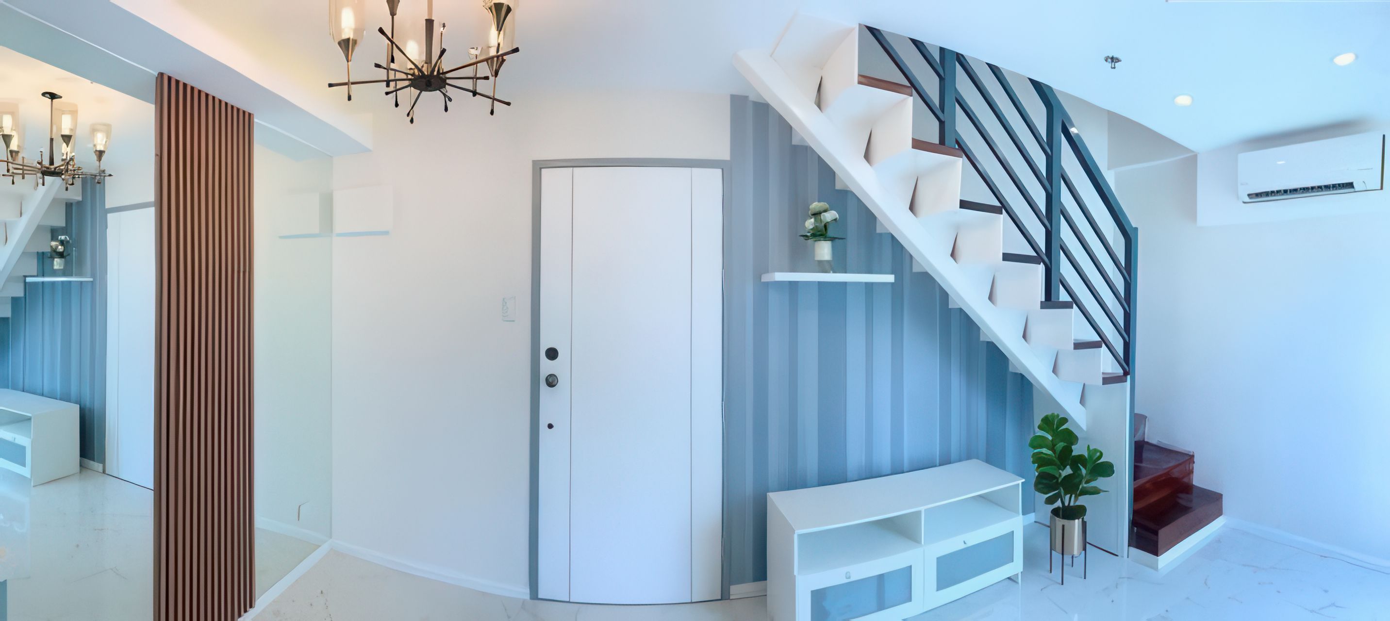 • Living Space & Entryway: The living area features a sleek, minimalist design with a color palette dominated by cool blues, white, and light gray. The modern staircase with geometric cutouts and contrasting railings adds an artistic flair while the chandelier above provides ambient lighting, enhancing the overall sophistication of the space.