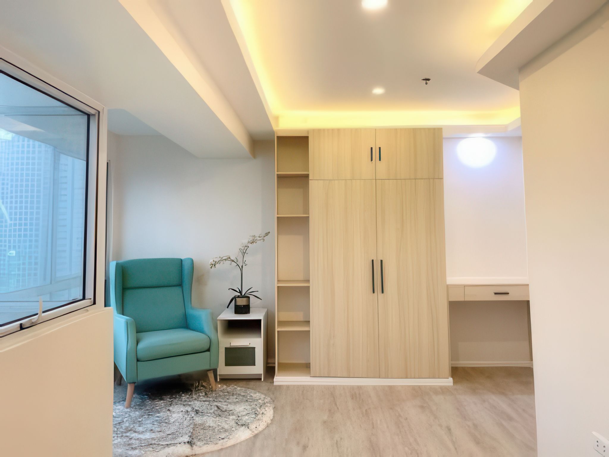 • Bedroom: The bedroom exudes a calming atmosphere with a focus on light wood tones and soft lighting. The built-in wardrobe and matching storage units offer ample space, while the cozy armchair by the window provides a perfect spot for relaxation, offering a serene view of the cityscape.